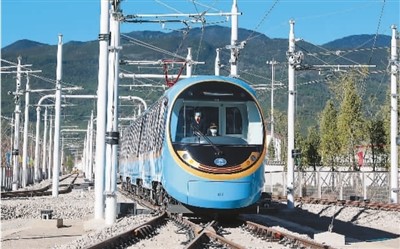 麗江觀光火車一期工程是云南省麗江市第一條城市軌道交通線路,連接世界文化遺產(chǎn)麗江古城與玉龍雪山5A級(jí)景區(qū),全長(zhǎng)約20.8公里,設(shè)計(jì)時(shí)速70公里。11月28日,該工程正式進(jìn)入通車試運(yùn)行階段。圖為觀光火車駛出麗江觀光火車一期工程車輛基地。