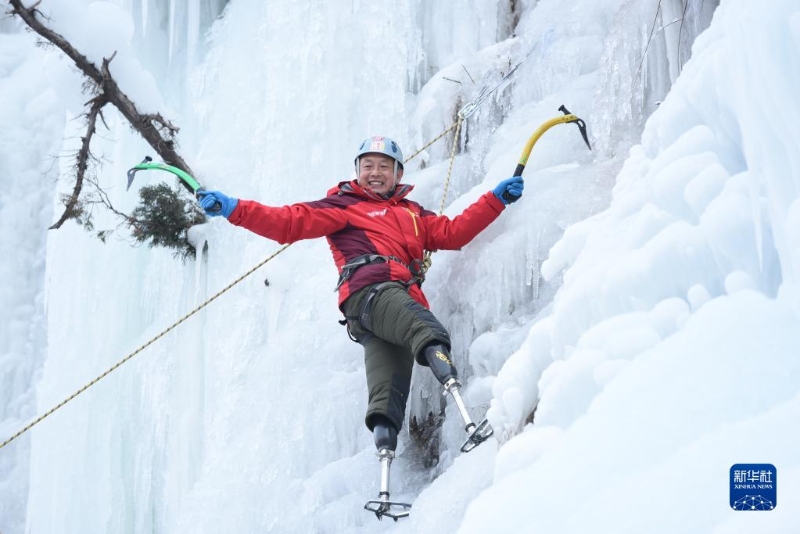 夏伯渝在北京房山區(qū)霞云嶺攀冰(2017年1月17日攝)。因截肢而中斷運(yùn)動(dòng)員生涯的夏伯渝,69歲登上珠峰之巔,成為極少數(shù)登上珠峰的雙腿截肢者之一。新華社發(fā)