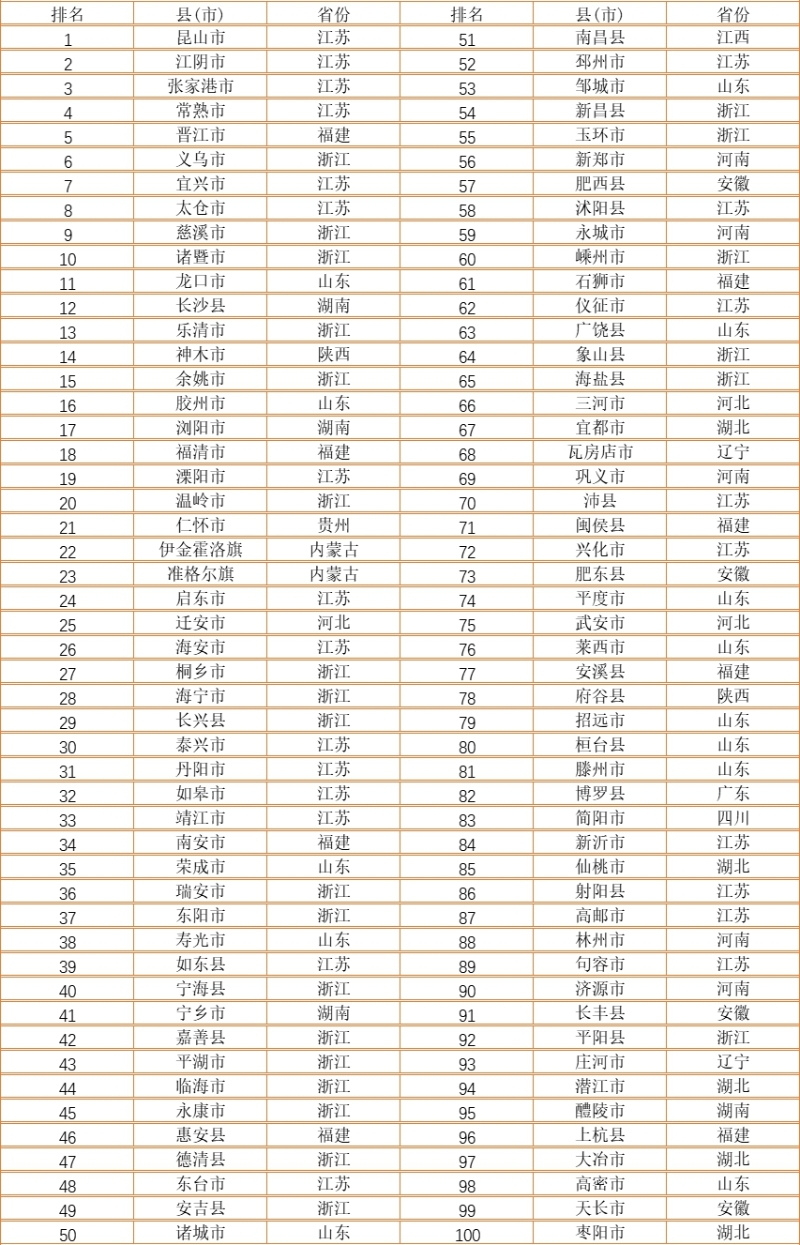 榜單顯示,全國綜合競爭力前10強縣(市)分別是昆山市、江陰市、張家港市、常熟市、晉江市、義烏市、宜興市、太倉市、慈溪市和諸暨市。