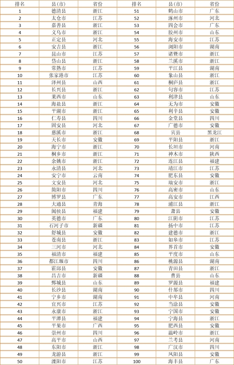 榜單顯示,全國投資潛力前10強縣(市)分別是德清縣、太倉市、嘉善縣、義烏市、正定縣、安吉縣、昆山市、岱山縣、常熟市和張家港市。共有46個投資潛力百強縣(市)也同時是綜合競爭力百強縣(市)。