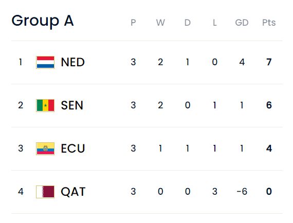 最終,荷蘭隊(duì)積7分排名本組第一,橙衣軍團(tuán)將在八分之一決賽中對(duì)陣B組第二名。塞內(nèi)加爾積6分排名次席,他們?cè)诎朔种粵Q賽中對(duì)手是B組頭名。積4分的厄瓜多爾在最后時(shí)刻失去了出線資格,而東道主卡塔爾遭遇三連敗,但打入了隊(duì)史世界杯首粒進(jìn)球。