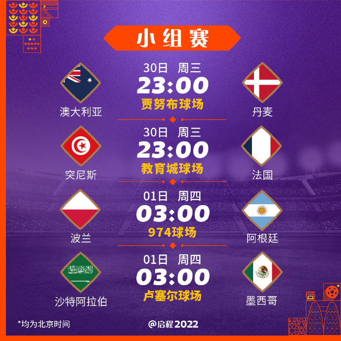 四場比賽具體為:D組23:00突尼斯對陣法國;D組23:00澳大利亞對陣丹麥;C組3:00沙特阿拉伯對陣墨西哥;C組3:00波蘭對陣阿根廷。