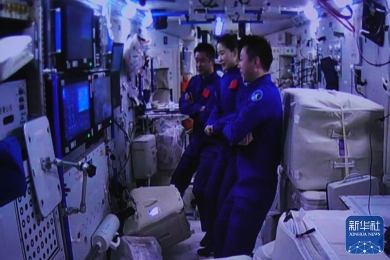 11月30日在酒泉衛(wèi)星發(fā)射中心拍攝的神舟十四號(hào)航天員劉洋、蔡旭哲在問天實(shí)驗(yàn)艙迎接神舟十五號(hào)航天員乘組的畫面。新華社記者 郭中正 攝