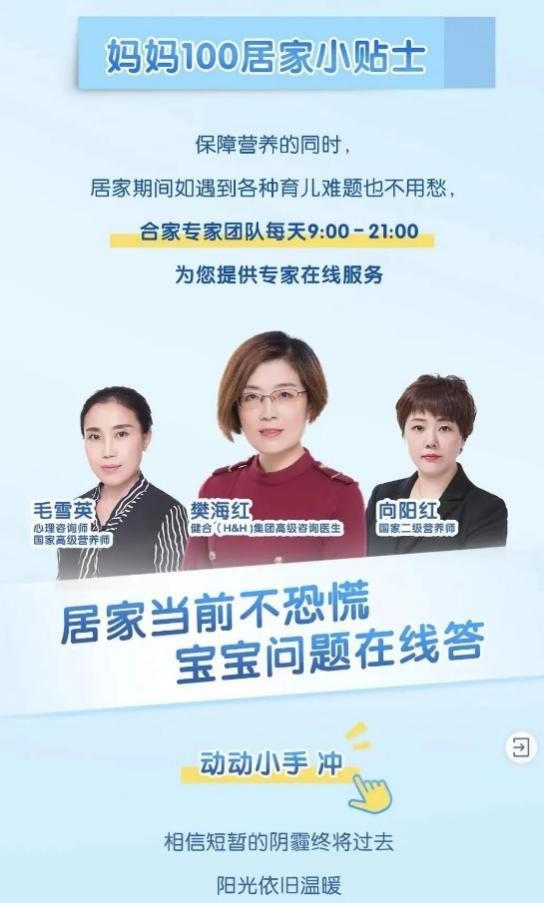 同時,健合還針對不同地區(qū)的教育團(tuán)隊(duì)及時對接專家資源,開展了線上專業(yè)教育指導(dǎo)行動。在疫情期間讓寶媽們了解更多寶寶成長中需要注意的關(guān)鍵點(diǎn),為寶貝健康成長提供科學(xué)指導(dǎo)。并且,集團(tuán)還開通了產(chǎn)品直送通道,在全國范圍內(nèi)集合各方資源和運(yùn)力開啟奶粉紙尿褲益生菌直送通道,合力守護(hù)疫情之下母嬰健康。