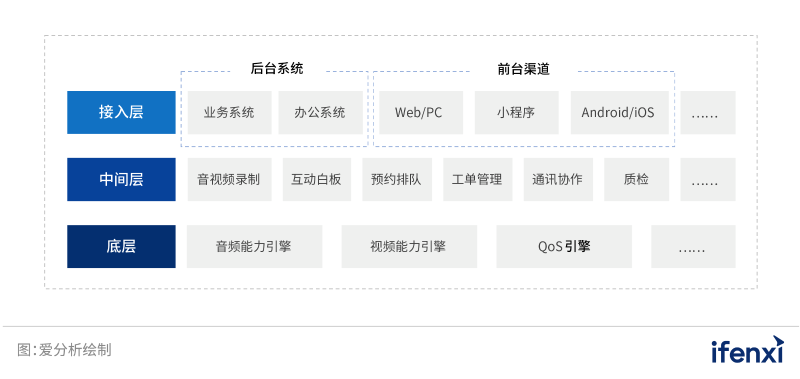 音視頻中臺往往采用分層解耦架構(gòu)設(shè)計,整體共分為三層:底層是原子化的音視頻技術(shù),針對各場景通用的能力要求提供音視頻引擎;中間層是對反復(fù)應(yīng)用的功能或規(guī)則,形成多個標(biāo)準(zhǔn)化的功能模塊和服務(wù)組件;最上層是接入層,涵蓋面向保司的各類信息系統(tǒng)和面向客戶的多種渠道。除此之外,音視頻中臺還在中間層增添了一定的AI能力,提升音視頻中臺的智能化程度。
