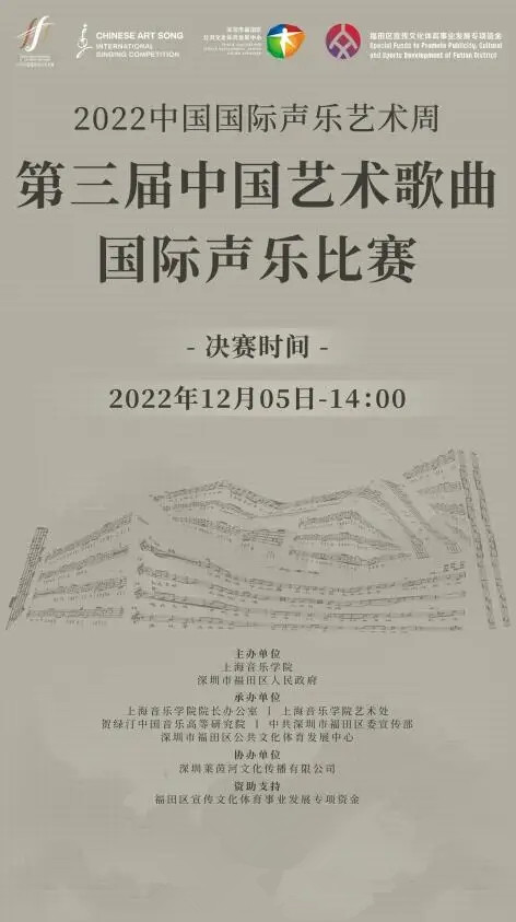 2022中國國際聲樂藝術(shù)周之第三屆“中國藝術(shù)歌曲國際聲樂比賽”決賽階段將于12月5日下午14:00正式開啟網(wǎng)絡(luò)直播。更多藝術(shù)周詳情和決賽直播鏈接敬請關(guān)注深圳市福田區(qū)公共文化體育發(fā)展中心網(wǎng)站,中國藝術(shù)歌曲國際聲樂比賽官方網(wǎng)站,以及微信公眾號的推文。歡迎廣大市民群眾在線觀看。(供稿:深圳萊茵河文化傳播有限公司 撰文:方博 )