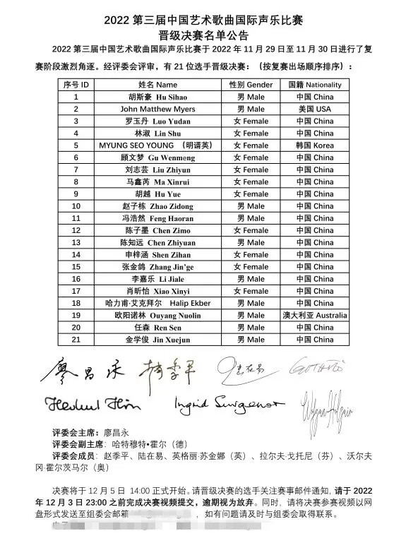 經(jīng)過兩日的激烈角逐,胡斯豪、John Matthew Myers、羅玉丹等21名選手進(jìn)入最終的決賽階段。決賽將繼續(xù)采用線上提交演唱視頻的方式進(jìn)行評比,選手在賽事規(guī)定的近代作曲家青主、黃自、趙元任、丁善德等,和當(dāng)代作曲家趙季平、陸在易、葉小綱、印青等經(jīng)典中國藝術(shù)歌曲創(chuàng)作中各選擇一首作品演唱。