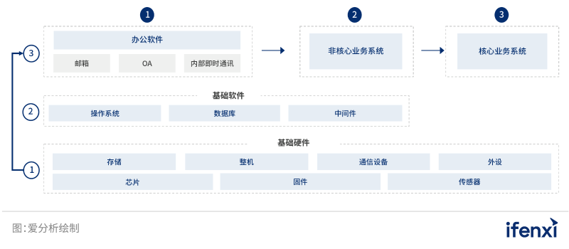 近年來,受中美貿易戰(zhàn)、科技戰(zhàn)等內外部多重因素影響,進行信息技術應用創(chuàng)新(以下簡稱信創(chuàng)),打造全面自主可控的國產IT架構,已逐漸成為我國構筑核心安全屏障,實現(xiàn)經(jīng)濟數(shù)字化轉型、提升產業(yè)鏈發(fā)展的重要戰(zhàn)略方針。在這一背景下,自2020年開始,伴隨著支持政務信息化安全可控、金融行業(yè)信息化核心技術安全可控的政策密集出臺,以黨政、金融為首全面信創(chuàng)趨勢不斷演進。各行業(yè)逐步摸索出從基礎硬件、到基礎軟件、再到應用軟件的縱向替換路徑,以及從OA系統(tǒng)、到非核心業(yè)務系統(tǒng)、再到核心業(yè)務系統(tǒng)的橫向路徑。