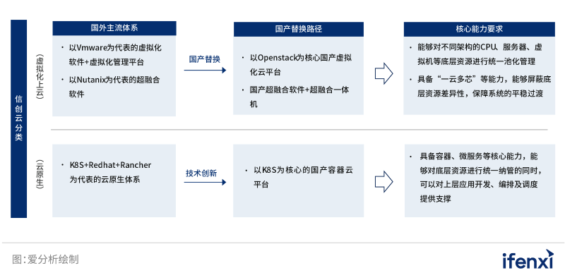 除底層基礎設施的國產化替換外,在當今數(shù)字化轉型的浪潮下,云平臺作為企業(yè)IT核心平臺軟件,能夠向下對接IT基礎設施,向上承接企業(yè)應用,有效提升底層資源利用效率。因此,云平臺的全面國產化,也成為了企業(yè)構建全棧自主可控IT架構的關鍵一環(huán)?,F(xiàn)階段,信創(chuàng)云大致可以分為三類,分別是傳統(tǒng)架構信創(chuàng)云(虛擬化)、云原生架構信創(chuàng)云以及超融合架構信創(chuàng)云。