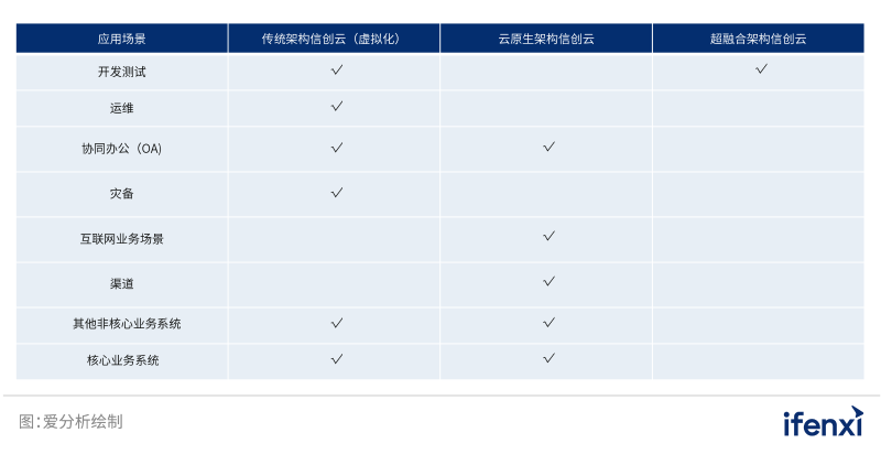在適用場景上,傳統(tǒng)架構信創(chuàng)云(虛擬化)適用于大多數(shù)集中式架構,且對應用開發(fā)、編排及調度需求較少的場景;云原生架構信創(chuàng)云,適用于高并發(fā)且已經(jīng)完成分布式改造,同時應用開發(fā)迭代效率要求較高的場景;超融合架構信創(chuàng)云,適用于對底層資源性能要求較低的邊緣場景。