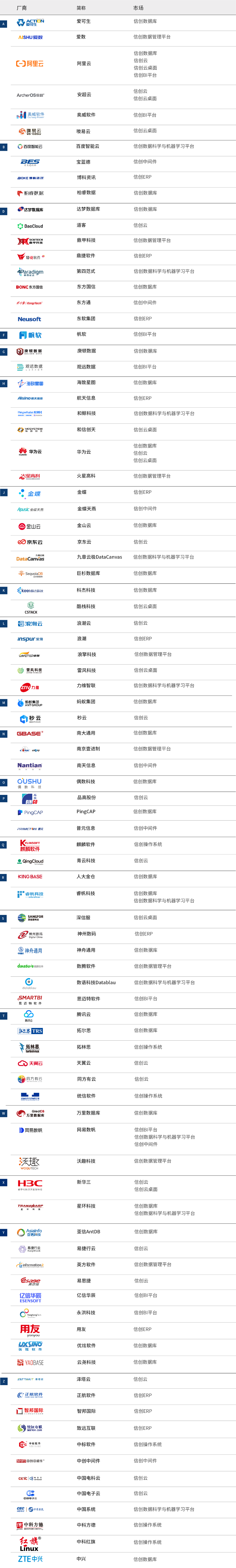 在報告中,愛分析綜合考慮甲方關注度及信創(chuàng)落地情況等因素,將重點選取數(shù)據(jù)庫、操作系統(tǒng)、中間件、信創(chuàng)云、云桌面、數(shù)據(jù)管理平臺、數(shù)據(jù)科學與機器學習平臺、ERP、BI平臺進行深入研究。