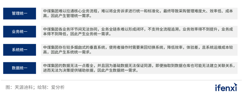 中煤集團(tuán)在發(fā)展過程中部署了多套采購(gòu)數(shù)字化相關(guān)軟件系統(tǒng),包括采購(gòu)商城、采購(gòu)合同管理系統(tǒng)、招標(biāo)系統(tǒng)、非招標(biāo)系統(tǒng)、財(cái)務(wù)管理系統(tǒng)等。這些系統(tǒng)部署于不同時(shí)期,并且供應(yīng)商大多各不相同,系統(tǒng)之間難以互通并產(chǎn)生諸多困擾。新問題產(chǎn)生新需求,中煤集團(tuán)對(duì)于采購(gòu)數(shù)字化的新需求可以總結(jié)為“四大統(tǒng)一”:管理統(tǒng)一、業(yè)務(wù)統(tǒng)一、系統(tǒng)統(tǒng)一和數(shù)據(jù)統(tǒng)一。