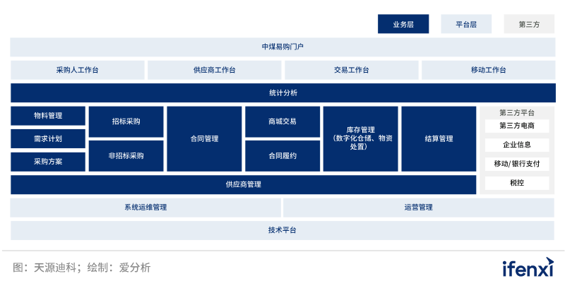 在架構(gòu)方面,中煤集團(tuán)提出“一張網(wǎng)、一個(gè)平臺(tái)”的總體架構(gòu),致力于實(shí)現(xiàn)采購(gòu)管理、采購(gòu)業(yè)務(wù)、交易管理、財(cái)務(wù)結(jié)算一體化的需求?!?張網(wǎng)”指12個(gè)業(yè)務(wù)中臺(tái)組成的供應(yīng)鏈管理體系,實(shí)現(xiàn)集團(tuán)采購(gòu)和交易一體化管理。“1個(gè)平臺(tái)”指中煤采購(gòu)一體化平臺(tái),統(tǒng)一門戶、統(tǒng)一管理 、統(tǒng)一運(yùn)營(yíng),并深化移動(dòng)辦公應(yīng)用。天源迪科基于旗下迪易采平臺(tái)進(jìn)行深度開發(fā),為“一張網(wǎng)、一個(gè)平臺(tái)”總體架構(gòu)的成功落地保駕護(hù)航。
