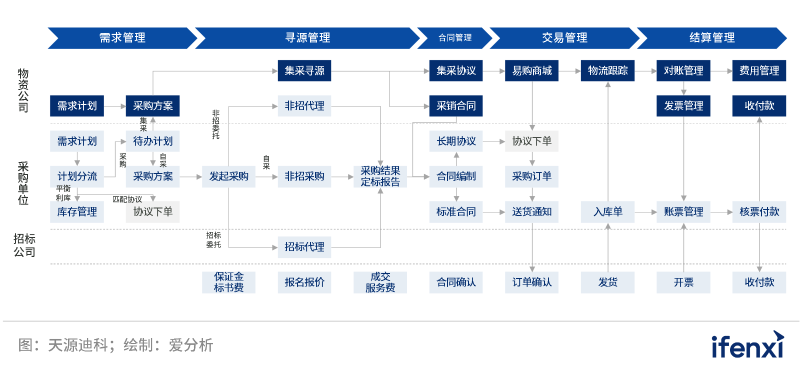 在業(yè)務(wù)流程方面,天源迪科通過采購(gòu)一體化平臺(tái)建設(shè),幫助中煤集團(tuán)實(shí)現(xiàn)了需求管理、尋源管理、合同管理、交易管理、結(jié)算管理全流程在線流轉(zhuǎn),實(shí)現(xiàn)高效的統(tǒng)一業(yè)務(wù)處理。