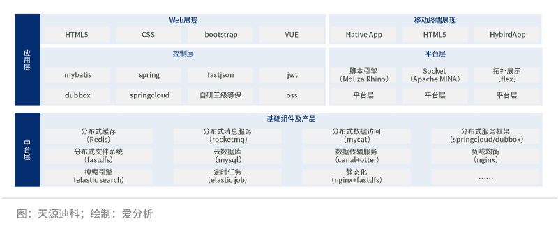 在技術(shù)方面,天源迪科采用分層提供服務(wù)支持的設(shè)計(jì)思想,將系統(tǒng)劃分為應(yīng)用層、中臺(tái)層。