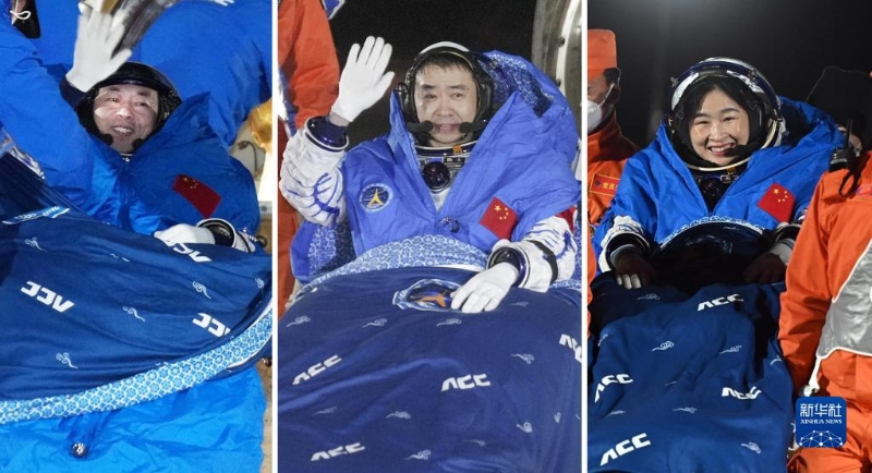 12月4日,神舟十四號(hào)載人飛船返回艙在東風(fēng)著陸場(chǎng)成功著陸。這是航天員陳冬(中)、劉洋(右)、蔡旭哲安全順利出艙(拼版照片)。新華社發(fā)