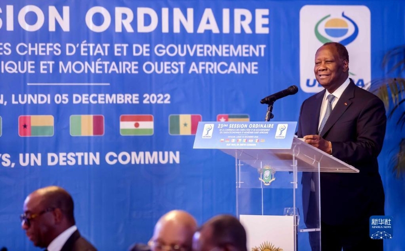 12月5日,在科特迪瓦經(jīng)濟(jì)首都阿比讓,科特迪瓦總統(tǒng)瓦塔拉在西非經(jīng)濟(jì)貨幣聯(lián)盟第23屆國家元首和政府首腦會(huì)議上講話。