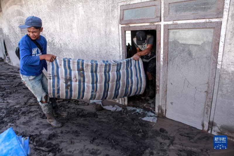 12月6日,在印度尼西亞東爪哇省盧馬姜縣松伯武盧村,人們扛著床墊撤離受火山噴發(fā)影響的區(qū)域。