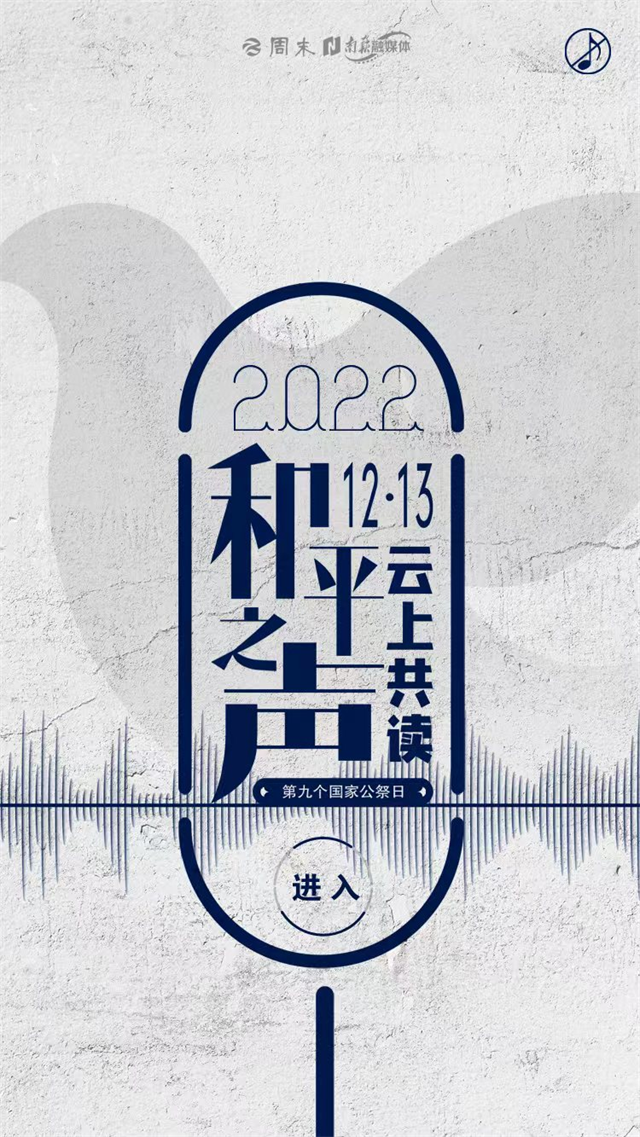 2022年12月,第九個(gè)國家公祭日前夕,難忘85年前的苦與痛,我們?yōu)槭耪甙?,為和平祈。?2·12 和平之夜”接力誦讀即將舉行,讓每一支蠟燭的光,每一句誦讀的聲,以文字的靈魂、聲音的力量,行祭之禮,在歷史痛感中砥礪前行,不忘歷史,矢志復(fù)興。