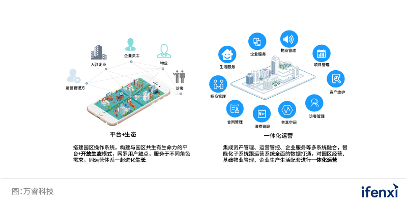 萬睿科技的智慧園區(qū)解決方案是通過“平臺+生態(tài)”與一體化運(yùn)營模式服務(wù)于廣大客戶。其中,平臺+生態(tài)方面,萬睿科技通過搭建園區(qū)操作系統(tǒng),構(gòu)建與園區(qū)共生有生命力的“平臺+開放生態(tài)”模式,融入產(chǎn)業(yè)、商務(wù)、商業(yè)、居住等城市功能,網(wǎng)羅用戶觸點(diǎn),服務(wù)園區(qū)不同角色需求。一體化運(yùn)營方面,萬??萍纪ㄟ^集成資產(chǎn)管理、運(yùn)營管控、企業(yè)服務(wù)等多個(gè)系統(tǒng),全面打通智能化子系統(tǒng)與運(yùn)營系統(tǒng)數(shù)據(jù),對園區(qū)經(jīng)營、 基礎(chǔ)物業(yè)管理、企業(yè)生產(chǎn)生活配套進(jìn)行一體化運(yùn)營,助力園區(qū)人才聚集及產(chǎn)業(yè)成長。