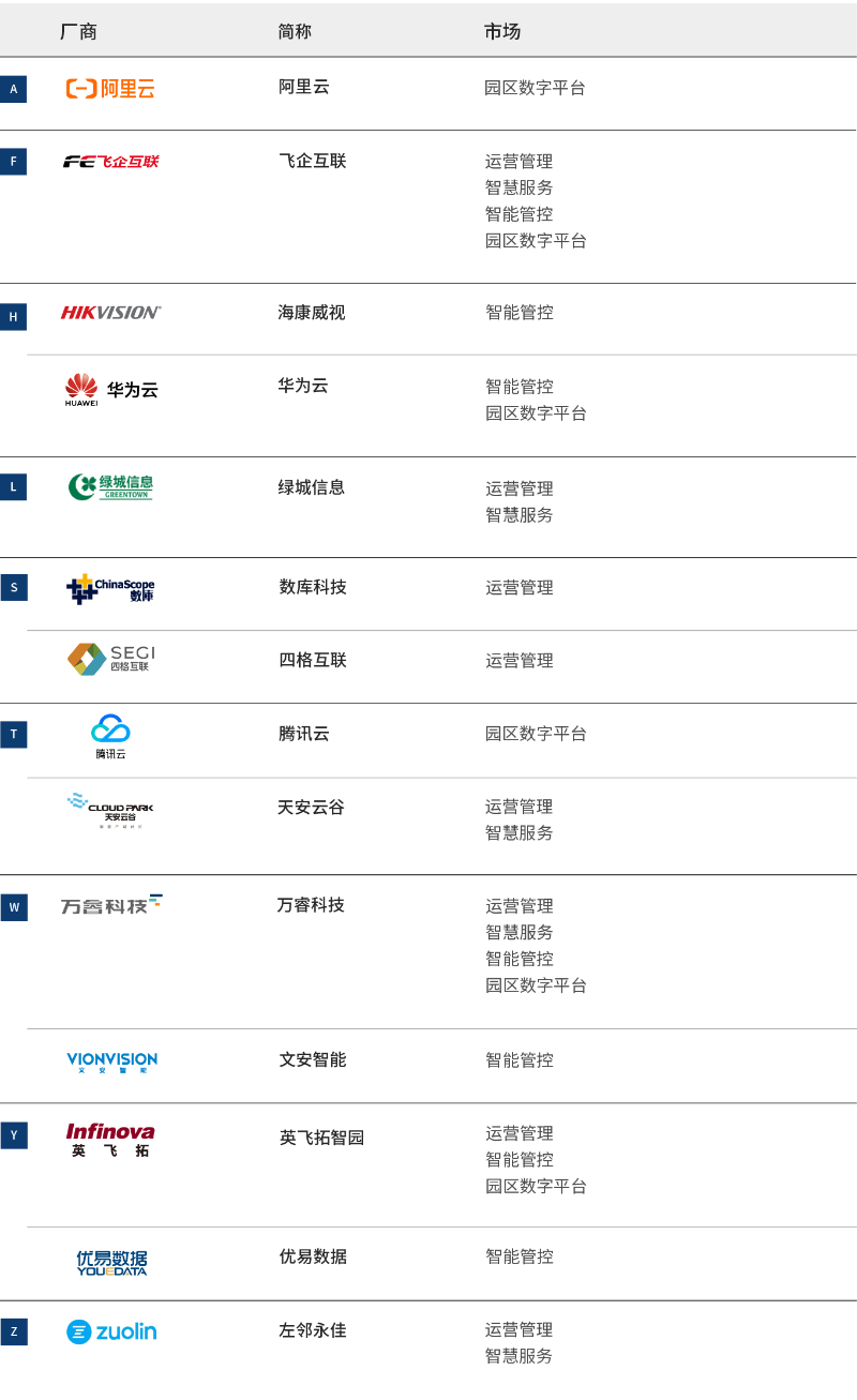 愛分析基于對甲方企業(yè)和典型廠商的調(diào)研以及桌面研究,遴選出在智慧園區(qū)各市場中具備成熟解決方案和落地能力的入選廠商。