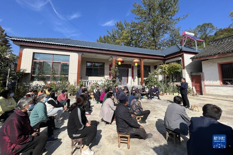 11月18日,在甘肅省隴南市成縣店村鎮(zhèn)卯堡村,駐村干部通過“農(nóng)家板凳會”的形式開展黨的二十大精神宣講。新華社發(fā)