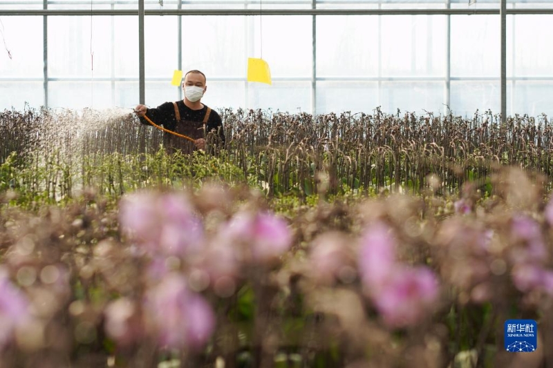 12月7日,河北省石家莊市元氏縣殷村鎮(zhèn)農(nóng)民在溫室大棚里管護(hù)鮮花。