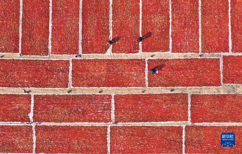 12月7日,在安徽省亳州市譙城區(qū)華佗鎮(zhèn)黃莊村,藥農(nóng)在晾曬中藥材梔子(無人機(jī)照片)。