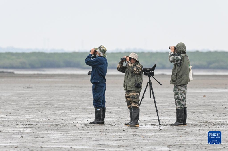 12月5日,儋州灣濕地護鳥隊隊長陳正平(中)和隊員在儋州市一處濕地巡護、觀測鳥類。