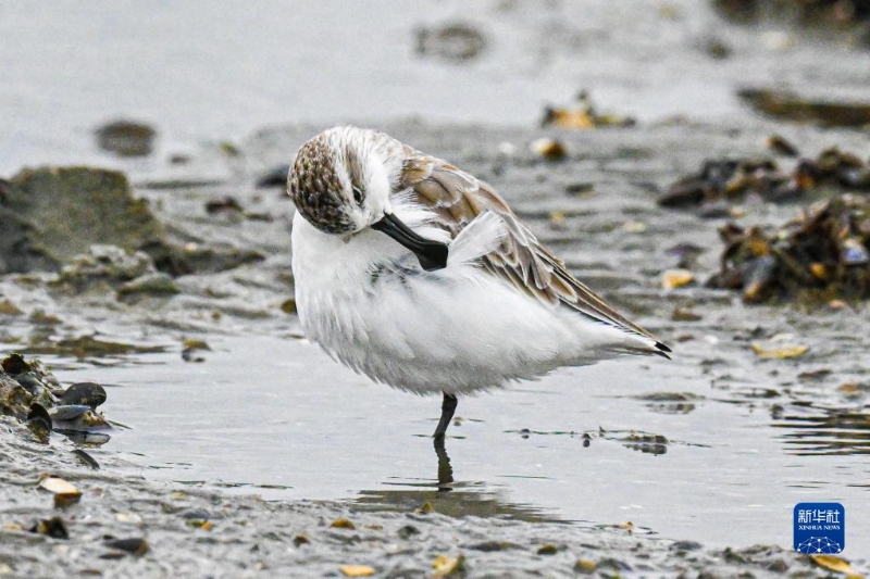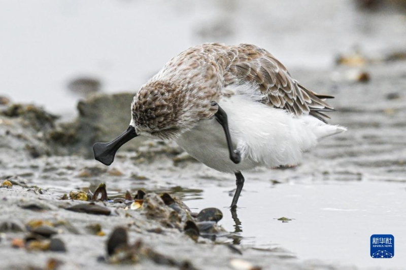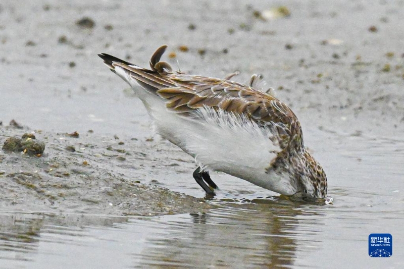 12月5日,勺嘴鷸在海南省儋州市一處濕地覓食。