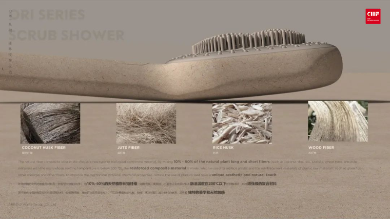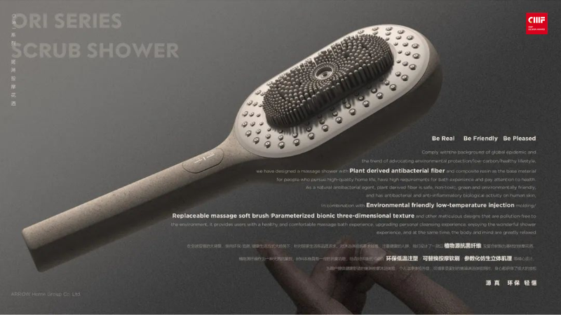 ORI系列搓淋按摩花灑具備CMF設(shè)計(jì)所要求的創(chuàng)新性、美觀性、功能性、落地性、環(huán)保性與情感性六大維度,在色彩上以整體中性自然色系,豐富視覺(jué)層次;在材料上,創(chuàng)新運(yùn)用植物纖維環(huán)保注塑材料,如椰子殼纖維、黃麻纖維、稻殼、活木等,還原天然纖維的自然色澤、氣味與觸感;在工藝上,精心設(shè)計(jì)的手柄長(zhǎng)度、角度,刷頭采用可替換拆卸結(jié)構(gòu)、可選擇不同軟硬刷頭以及多種水形切換,都帶來(lái)升級(jí)的搓澡享受,賦予消費(fèi)者重回自然的親切與歡愉。