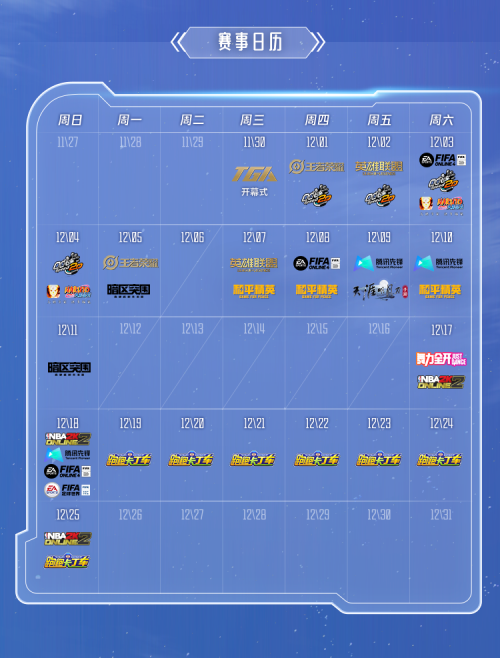 本次賽事自11月30日持續(xù)至12月25日,整個賽事周期將同時帶來騰訊入亞項目測試賽、TGA騰訊電競運動會和“金牌玩家”系列活動,涵蓋15個賽事,為全國電競愛好者帶來一場多元化的賽事盛宴。
