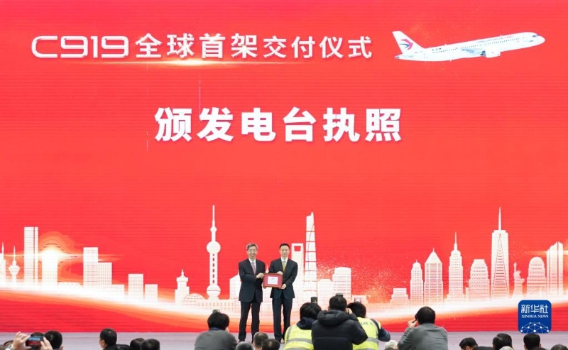 12月9日,在交付儀式現(xiàn)場(chǎng),民航華東地區(qū)管理局向東航頒發(fā)電臺(tái)執(zhí)照。