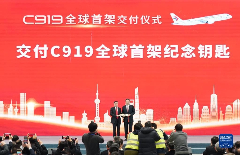 12月9日,在交付儀式現(xiàn)場(chǎng),C919主制造商中國(guó)商飛向東航交付“C919全球首架紀(jì)念鑰匙”。