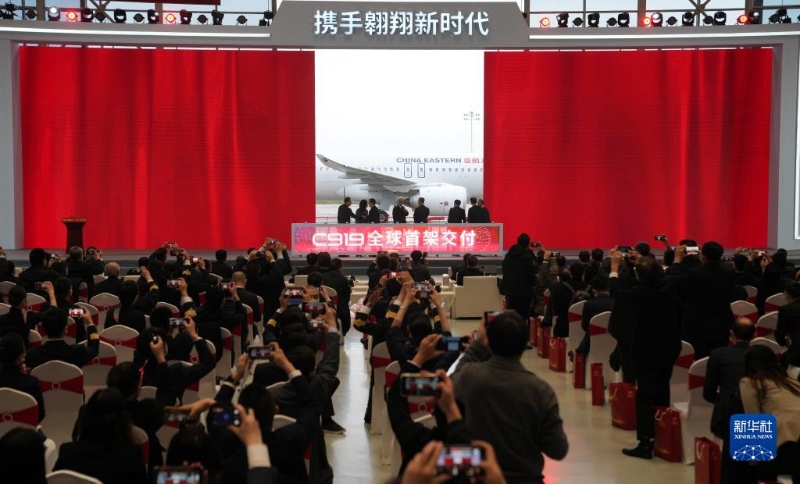 12月9日拍攝的國(guó)產(chǎn)大飛機(jī)C919交付全球首家用戶東航的儀式現(xiàn)場(chǎng)。