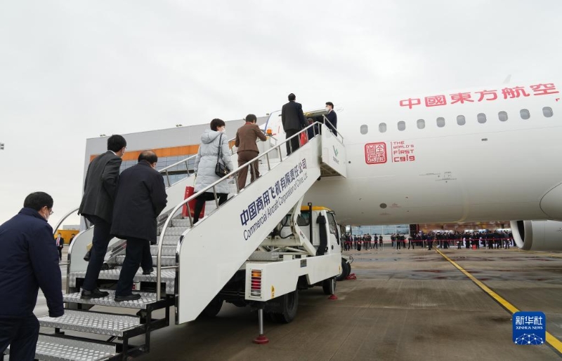 12月9日,國(guó)產(chǎn)大飛機(jī)C919準(zhǔn)備從上海浦東飛往虹橋完成“首秀”飛行,乘客有序登機(jī)。