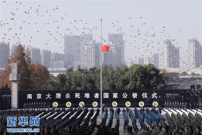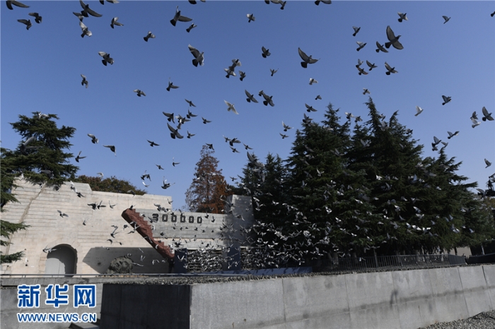 這是12月13日拍攝的南京大屠殺死難者國家公祭儀式現(xiàn)場?,F(xiàn)場放飛和平鴿。(新華社記者李博 攝)