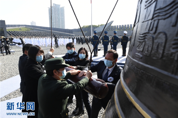 這是12月13日拍攝的南京大屠殺死難者國家公祭儀式現(xiàn)場?,F(xiàn)場撞響和平大鐘。(新華社記者李博 攝)