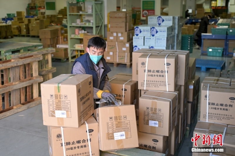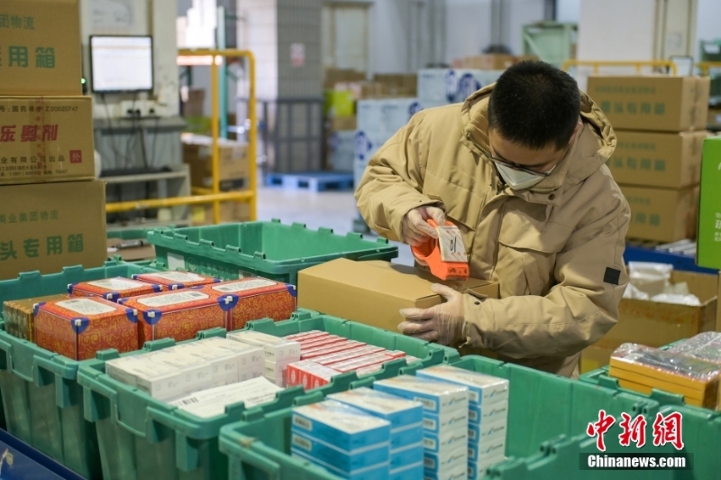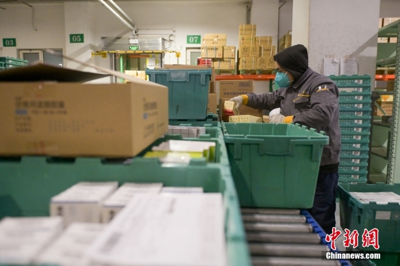 12月13日,北京,華潤(rùn)醫(yī)藥商業(yè)集團(tuán)有限公司北京物流中心內(nèi),工作人員在分揀打包藥品。中新社記者 趙文宇 攝