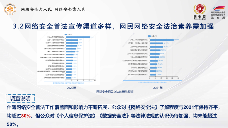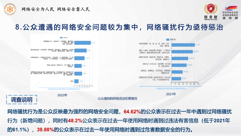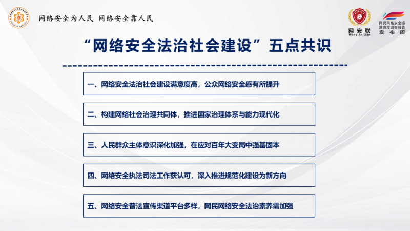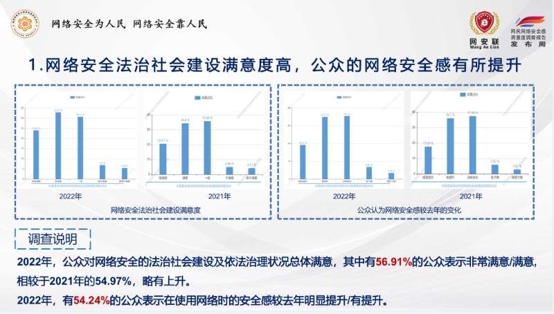 公安部第三研究所網(wǎng)絡(luò)安全法律研究中心主任黃道麗在會(huì)上正式發(fā)布《網(wǎng)絡(luò)安全法治社會(huì)建設(shè)專題報(bào)告》,報(bào)告基于2022年度網(wǎng)民網(wǎng)絡(luò)安全感滿意度調(diào)查活動(dòng)收集的303+萬(wàn)份有效問(wèn)卷數(shù)據(jù),圍繞法治建設(shè)、普法效果、司法工作、監(jiān)管執(zhí)法、個(gè)人信息安全、社會(huì)利益和國(guó)家信息安全等方面的問(wèn)題開(kāi)展調(diào)查,真實(shí)、客觀、全面反映了參與者對(duì)我國(guó)網(wǎng)絡(luò)空間安全建設(shè)治理的評(píng)價(jià),為國(guó)家推進(jìn)網(wǎng)絡(luò)安全法治社會(huì)建設(shè)工作、重拳打擊網(wǎng)絡(luò)違法犯罪行為的舉措、未來(lái)網(wǎng)絡(luò)空間安全建設(shè)和完善的方向提供詳情情民意支撐。報(bào)告中揭示了十二大結(jié)論,并形成五大共識(shí)。十二大結(jié)論分別是:一、網(wǎng)絡(luò)安全法治社會(huì)建設(shè)滿意度高,公眾的網(wǎng)絡(luò)安全感有所提升;