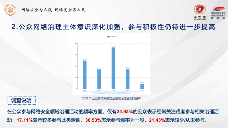會(huì)上,調(diào)查活動(dòng)組委會(huì)主任,公安部第一、三研究所原所長(zhǎng)嚴(yán)明作出總結(jié)講話。他表示該報(bào)告全面展現(xiàn)我國(guó)網(wǎng)絡(luò)安全法治社會(huì)建設(shè)立體新圖景,集中反映2022年網(wǎng)民對(duì)網(wǎng)絡(luò)安全法治建設(shè)情況的新感受,圍繞“網(wǎng)絡(luò)安全法治社會(huì)建設(shè)”專題調(diào)查問(wèn)題,聚焦立法需求、普法效果、協(xié)同治理等領(lǐng)域,分析得出12項(xiàng)結(jié)論,全面梳理2022年我國(guó)20余項(xiàng)政策立法最新動(dòng)態(tài),是聆聽(tīng)網(wǎng)民心聲、了解網(wǎng)民訴求、精準(zhǔn)把握我國(guó)網(wǎng)絡(luò)安全立法、執(zhí)法與司法態(tài)勢(shì)的重要途徑。