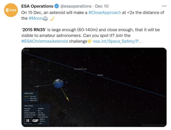 歐洲航天局推文寫道,“小行星2015 RN35足夠大,且飛得很近,可以被業(yè)余天文學(xué)家觀測到?!薄 ?/p>