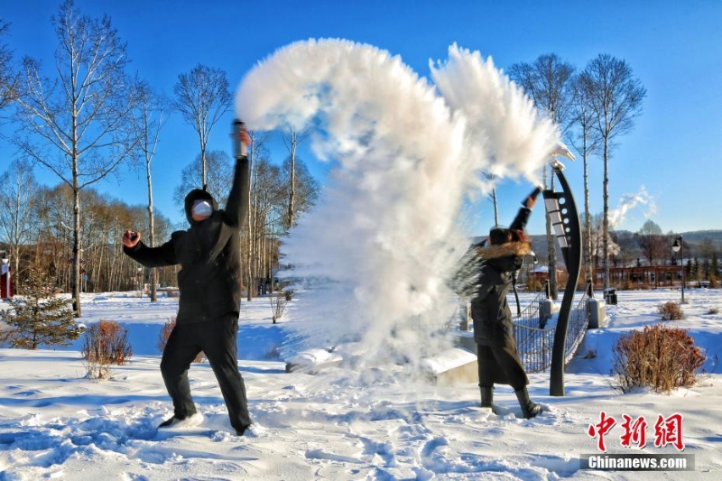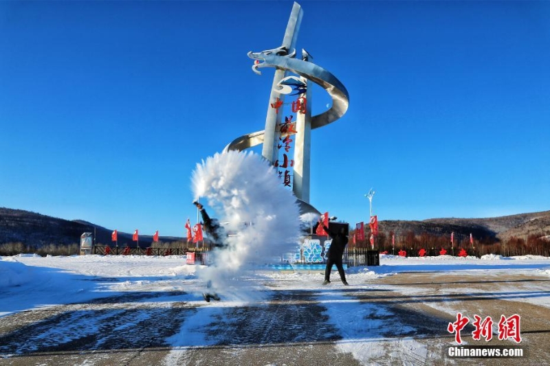 12月15日,受寒潮冷空氣影響,“中國最冷小鎮(zhèn)”黑龍江省大興安嶺呼中區(qū)出現(xiàn)強(qiáng)降溫天氣,最低氣溫達(dá)到-42.2℃,迎來今年入冬以來最冷一天。圖為游客體驗(yàn)“潑水成冰”。 中新社發(fā) 馮宏偉 攝