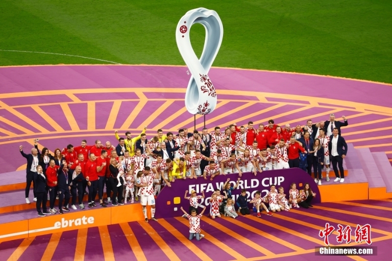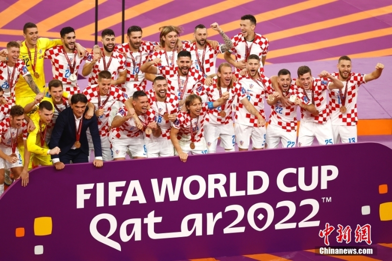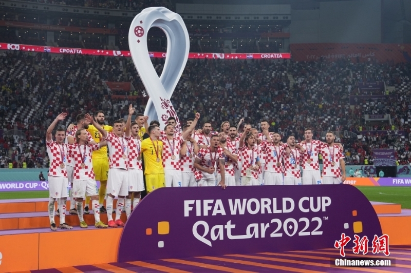 北京時間12月18日,2022卡塔爾世界杯季軍賽,克羅地亞隊2:1擊敗摩洛哥隊,獲得卡塔爾世界杯季軍。賽后,現(xiàn)場舉行頒獎儀式,克羅地亞隊球員們領(lǐng)取季軍獎牌。圖為頒獎現(xiàn)場。中新社記者 崔楠 攝