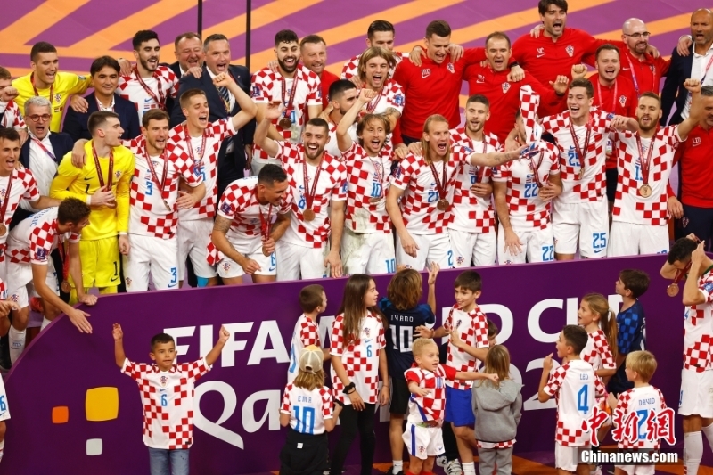 北京時間12月18日,2022卡塔爾世界杯季軍賽,克羅地亞隊2:1擊敗摩洛哥隊,獲得卡塔爾世界杯季軍。賽后,現(xiàn)場舉行頒獎儀式,克羅地亞隊球員們領(lǐng)取季軍獎牌。圖為克羅地亞隊球員們慶祝。中新社記者 崔楠 攝