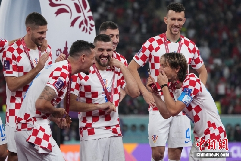 北京時間12月18日,2022卡塔爾世界杯季軍賽,克羅地亞隊2:1擊敗摩洛哥隊,獲得卡塔爾世界杯季軍。賽后,現(xiàn)場舉行頒獎儀式,克羅地亞隊球員們領(lǐng)取季軍獎牌。圖為莫德里奇佩戴季軍獎牌。中新社記者 崔楠 攝