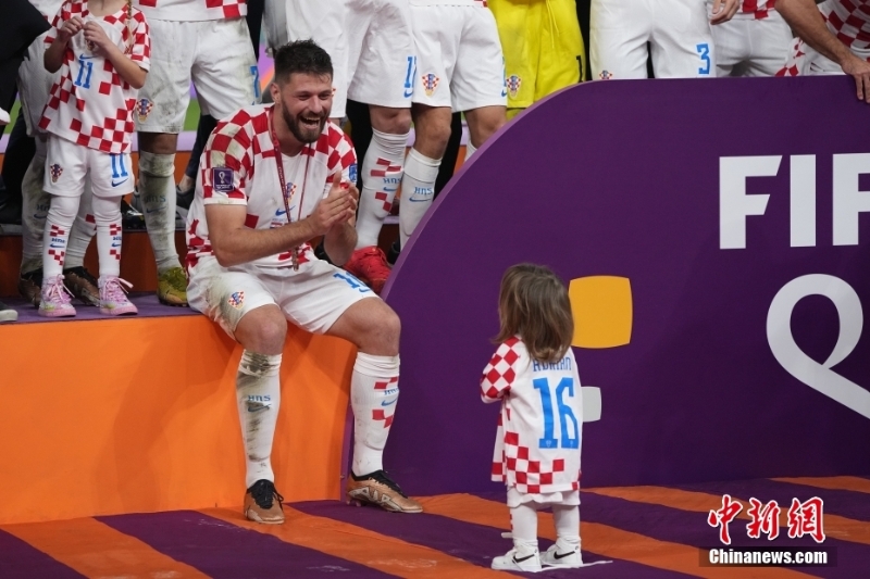 北京時間12月18日,2022卡塔爾世界杯季軍賽,克羅地亞隊2:1擊敗摩洛哥隊,獲得卡塔爾世界杯季軍。賽后,現(xiàn)場舉行頒獎儀式,克羅地亞隊球員們領(lǐng)取季軍獎牌。圖為克羅地亞隊球員與孩子一起慶祝。中新社記者 崔楠 攝