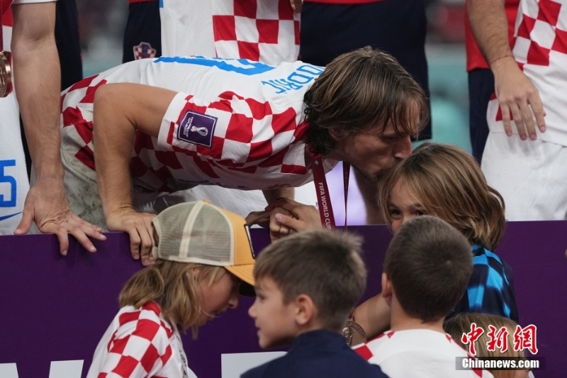 北京時間12月18日,2022卡塔爾世界杯季軍賽,克羅地亞隊2:1擊敗摩洛哥隊,獲得卡塔爾世界杯季軍。賽后,現(xiàn)場舉行頒獎儀式,克羅地亞隊球員們領(lǐng)取季軍獎牌。圖為莫德里奇親吻孩子。中新社記者 崔楠 攝