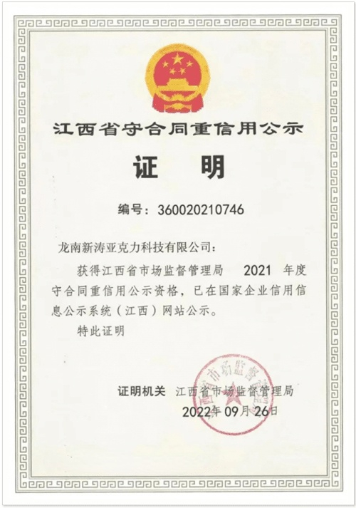 近期,江西省市場(chǎng)監(jiān)管局辦公室發(fā)布了《關(guān)于公布2021年度江西省守合同重信用公示單位的通知》,龍南新濤亞克力科技有限公司榮膺在列,并已獲得公示,這是龍南新濤繼獲得“贛州市守合同重信用公示單位”稱號(hào)以來(lái)的又一新成績(jī)。