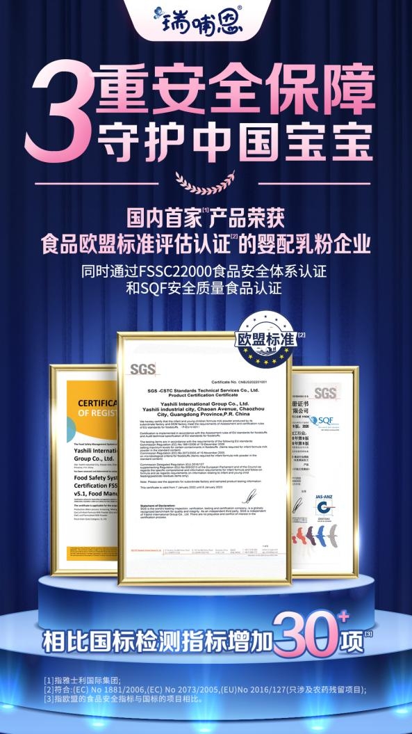 以創(chuàng)新為動力,以品質(zhì)為根基,承載守護(hù)國民健康的責(zé)任初心,為了更好地提升產(chǎn)品品質(zhì),蒙牛瑞哺恩對標(biāo)全球最嚴(yán)歐盟標(biāo)準(zhǔn)開啟覆蓋奶源、生產(chǎn)、加工全方位的質(zhì)量升級,交出國內(nèi)4家工廠順利拿下國際權(quán)威認(rèn)證機(jī)構(gòu)SGS授予的歐盟食品標(biāo)準(zhǔn)認(rèn)證的好成績,更成為國內(nèi)首款榮獲食品歐盟標(biāo)準(zhǔn)評估認(rèn)證的嬰配乳粉產(chǎn)品,持續(xù)保持行業(yè)質(zhì)量標(biāo)桿地位。